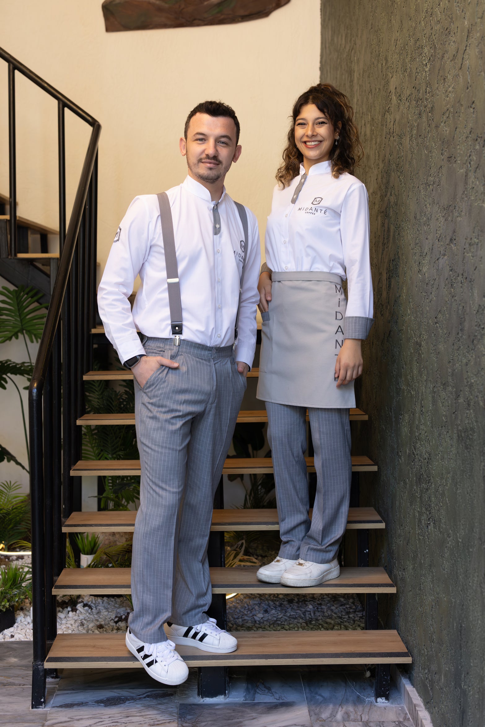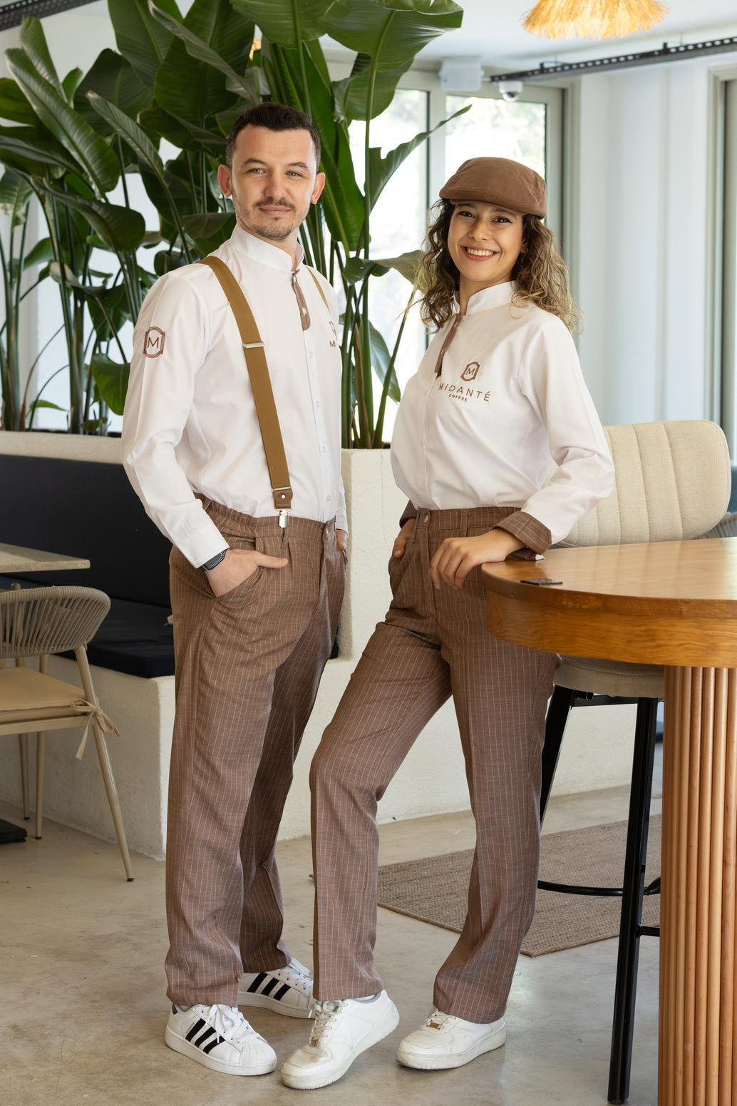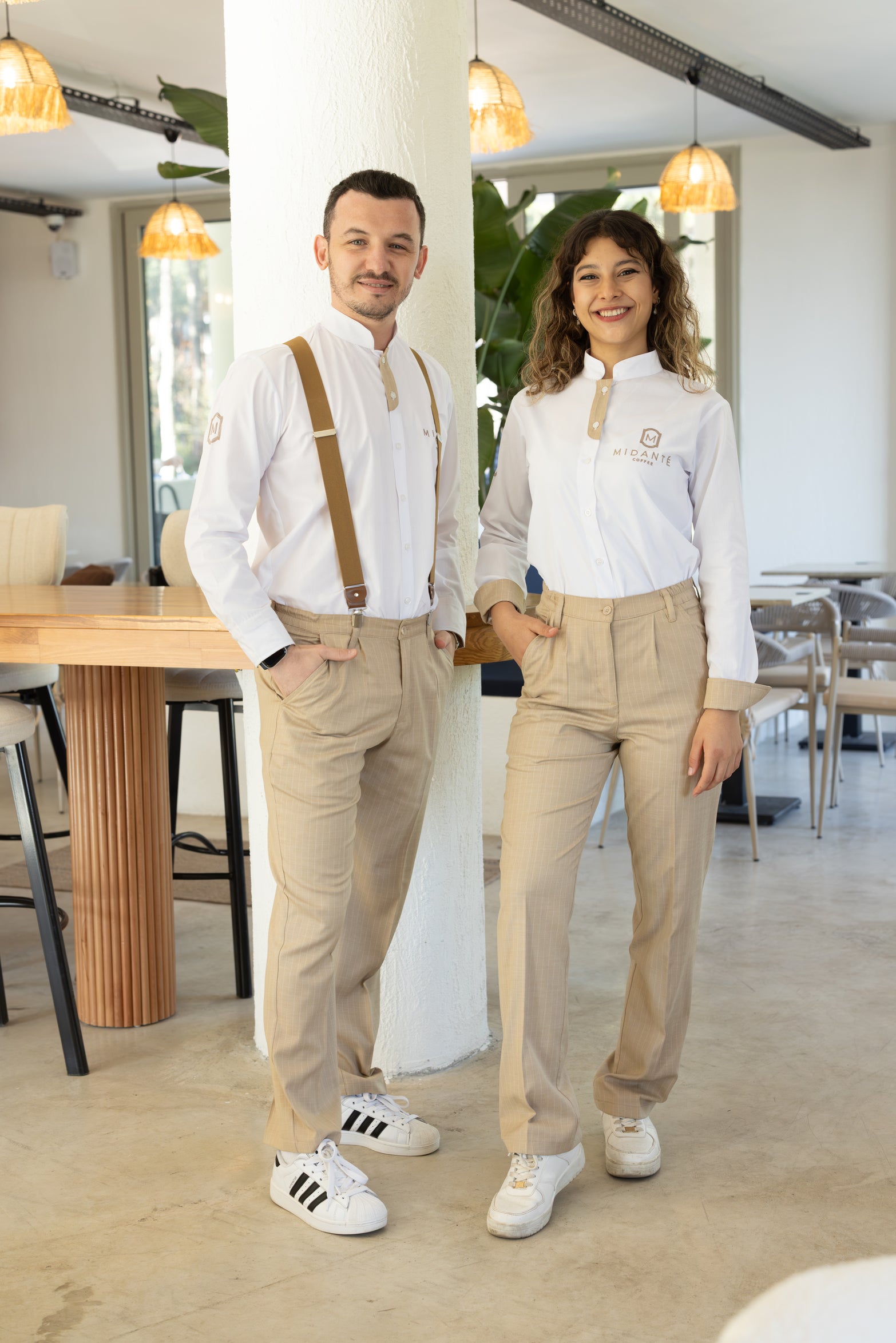 Gusto Takım, işletmenizin kurumsal duruşunu güçlendiren modern unisex uniforma koleksiyonudur. Tarçın, orta gri, bej ve siyah çizgili olmak üzere dört farklı renkte sunulur. Kadın modelleri etek veya pantolon seçenekleriyle, erkek modelleri ise askı aksesuarıyla tamamlanır. Şık dokulu kumaşı, rahat kalıbı ve logonuzla özelleştirilebilir yapısıyla restoran, kafe, otel ve butik işletmeler için mükemmel bir profesyonel çözüm sunar.